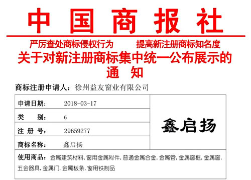 徐州益友門窗《鑫啟揚》品牌已注冊商標